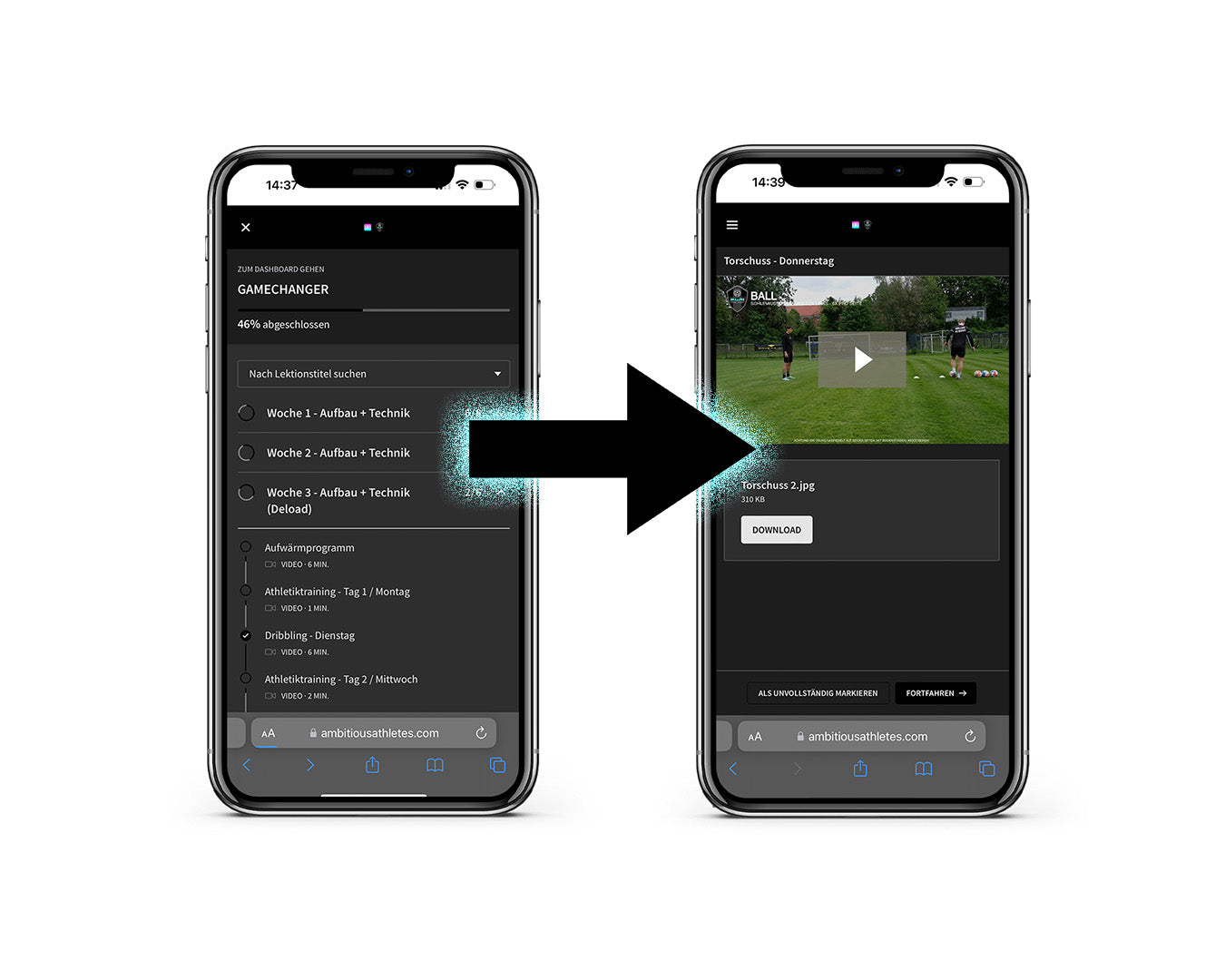 Nach dem Kauf erhältst du eine Schritt-für-Schritte Anleitung per E-Mail, um alle Videos auf der Webseite unseres Partners Ambitious Athletes abzurufen.